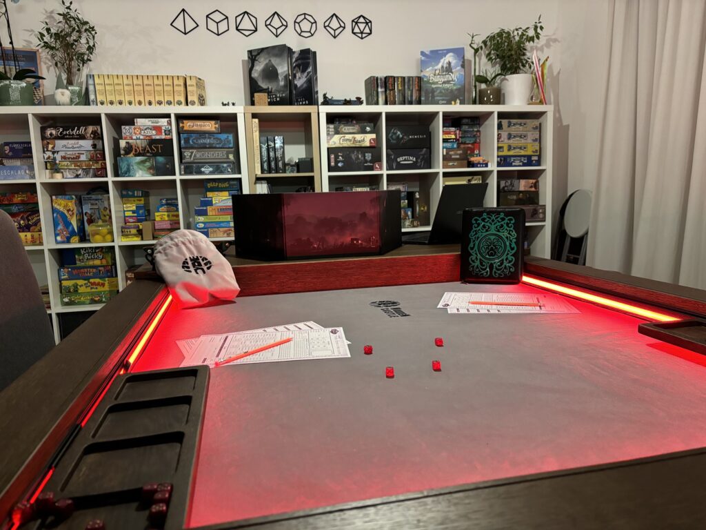 As for the table itself: wow! We were looking for an aesthetically pleasing board game table for quite some time and choosing ‘The Adventure’ table by Wooden Castle was just the right decision as it’s not just a great board game table but also an amazing piece of furniture. It’s durable, large enough for even the biggest games in our collection and it looks so amazingly good. The table itself is made from oak wood combined with really nice looking metallic legs. There’s black Aluminium bars around the table, for placing modular expansion parts such as bottle and mug-holders as well as player stations to store your game tokens. If the table serves as a dining table, those can be hidden inside the table, and it looks just as gorgeous - serving as a stylish looking, modern piece of furniture. The quality is top notch and the table itself feels very well crafted, constructed and designed. It has truly become the centerpiece of our gaming room and every person that sees the table for the first time is equally stunned.