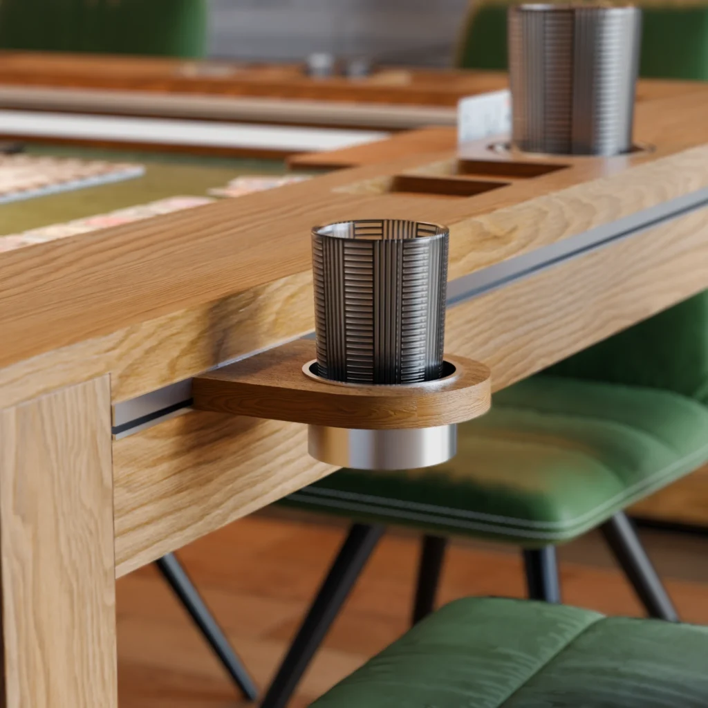 A holder with a cup that you can remove and wash. Suitable for drinks and game components. The internal diameter of the cup is 90 mm / 0.35”.