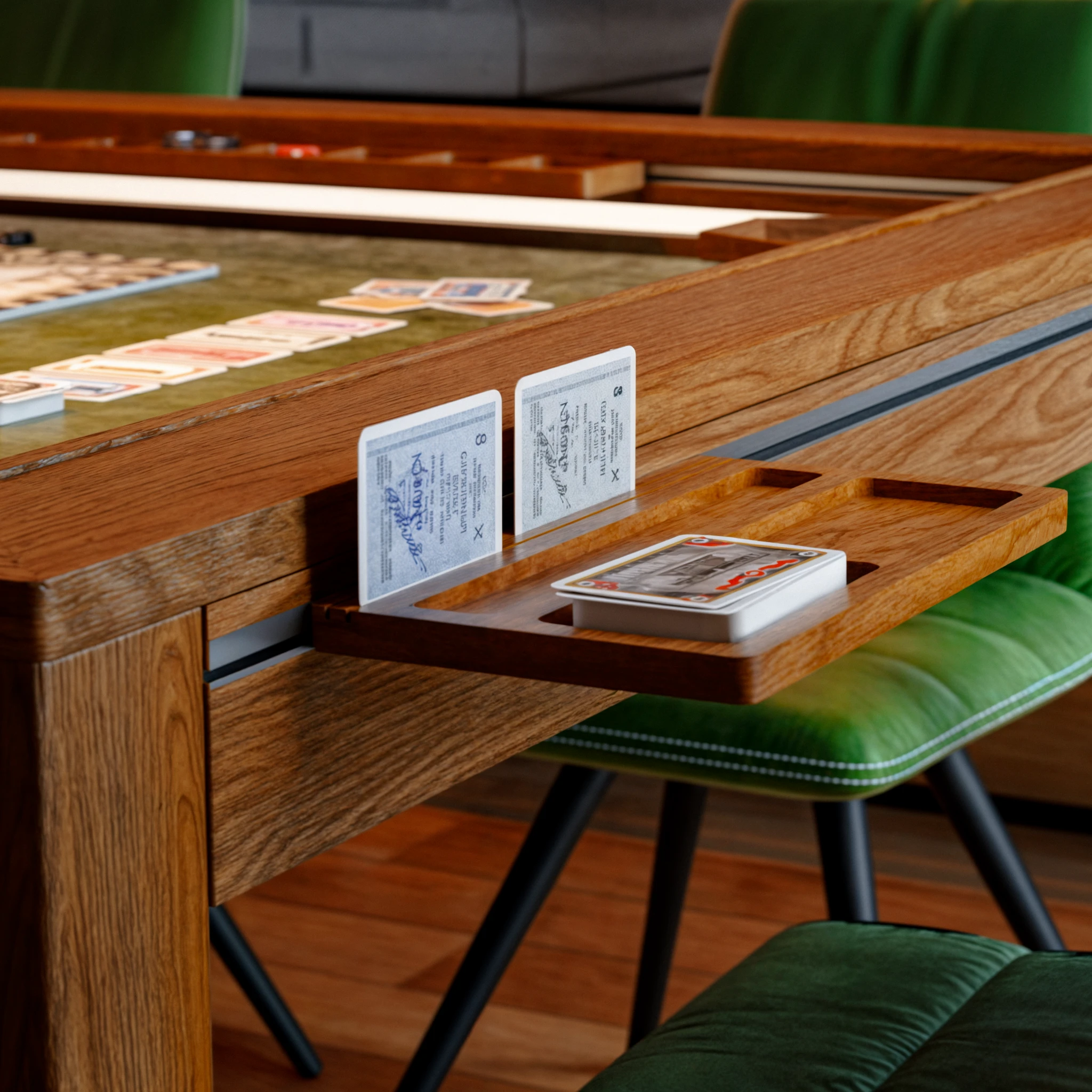 Player station with space for cards, pens, or resources. External: 38 x 20 cm / 15” x 7,9”. Ability to use it both on the outside and inside of the table.
